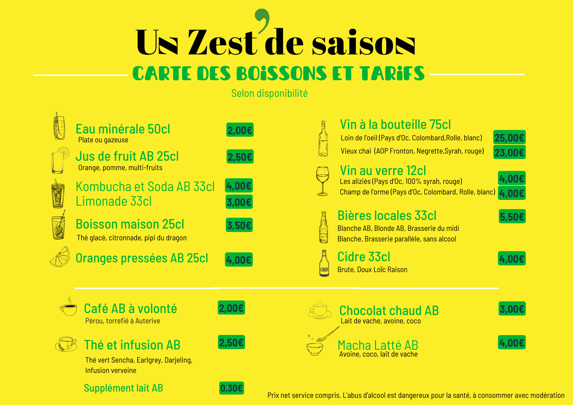 Plats et desserts fait maison, boissons locales, produits issues de l’agriculture bio